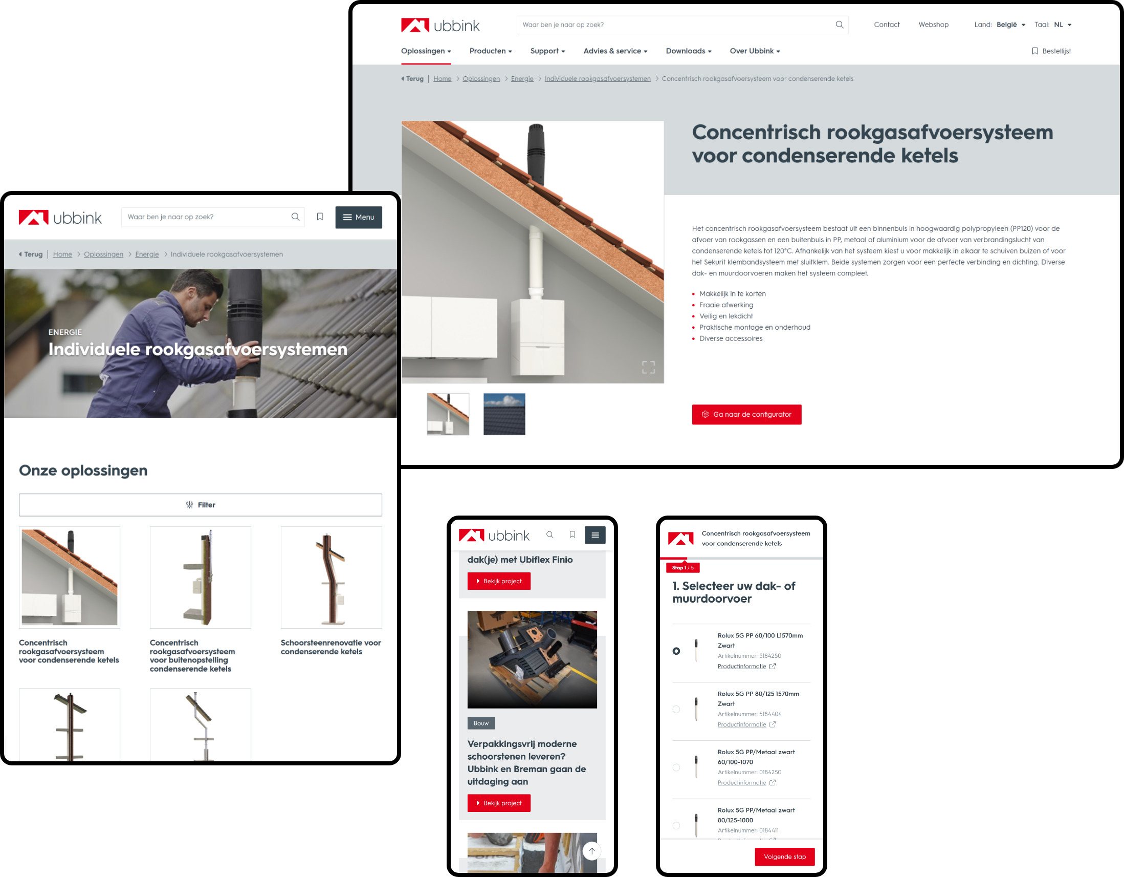 Om een goede basis voor het online platform te leggen is in sessies met de verschillende stakeholders gebrainstormd over een toekomstbestendige sitestructuur die toepasbaar is voor alle websites in verschillende landen. In het technisch vooronderzoek kwam naar voren dat SyncForce, de leverancier van het PIM-systeem van Ubbink, net werkte aan een nieuwe API. We besloten deze te gebruiken voor de koppeling met Kentico Xperience, waarin het platform is ontwikkeld.